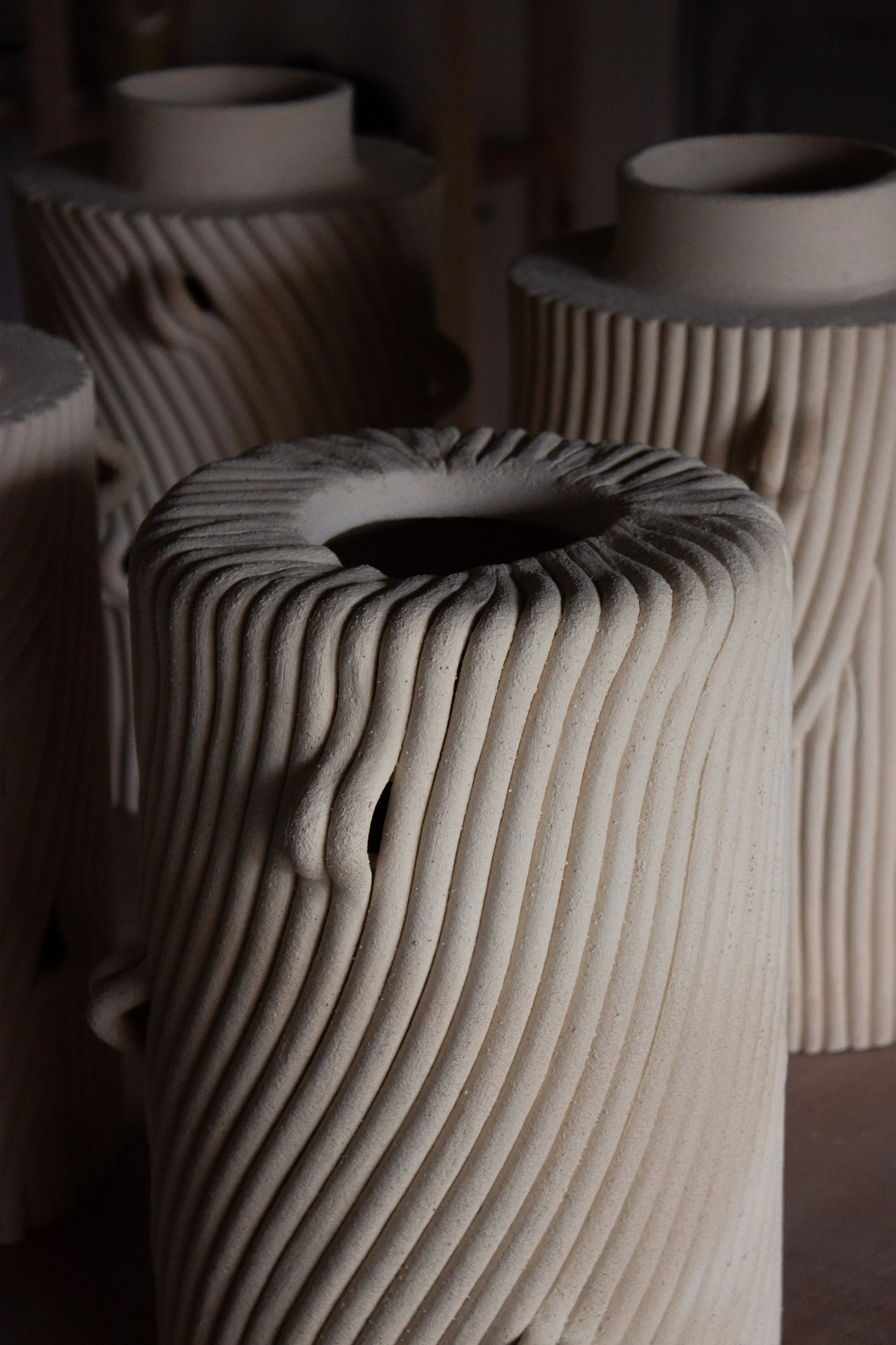 Cette collection est née d’un geste de révolte. Contre la raideur, contre l’immobilité, contre l’idée que la céramique doit se plier à des formes prévisibles, lisses, domestiquées. Ici, la terre ne se soumet pas. Elle s’étire, se tord, s’échappe. Elle danse, presque malgré elle, sous les doigts qui la poussent à l’excès, à l’imperfection, à la vie.